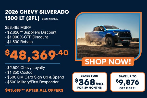 Stock: #26095. Lease for $368/mo for 39 months. 10K miles per year. MSRP $53,495. $2,626.60 SUPPLIER DISCOUNT. $1,000 X-CTP DISCOUNT. $1,500 Rebate. $2,500 CHEVY LOYALTY. $1,250 COSTCO. $500 GM CARD SIGN AND SPEND. $500 MILITARY/FIRST RESPONDER. Expires 04.30.26